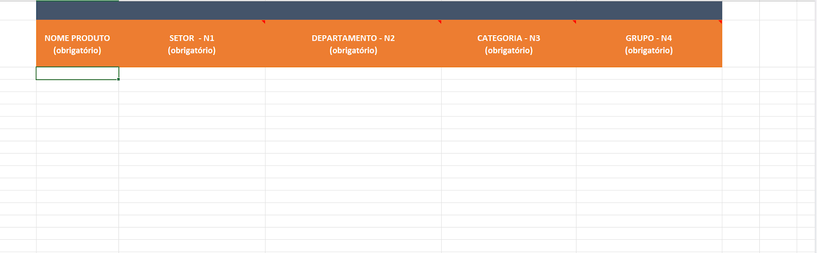 PS: Importante ressaltar que o preenchimento das categorias funciona em forma de cascata, ou seja, alterar o item selecionado na célula N1, vai mudar o que vai aparecer na célula N2, N3 e N4. Por isso, se atente em fazer a atualização na linha completa.