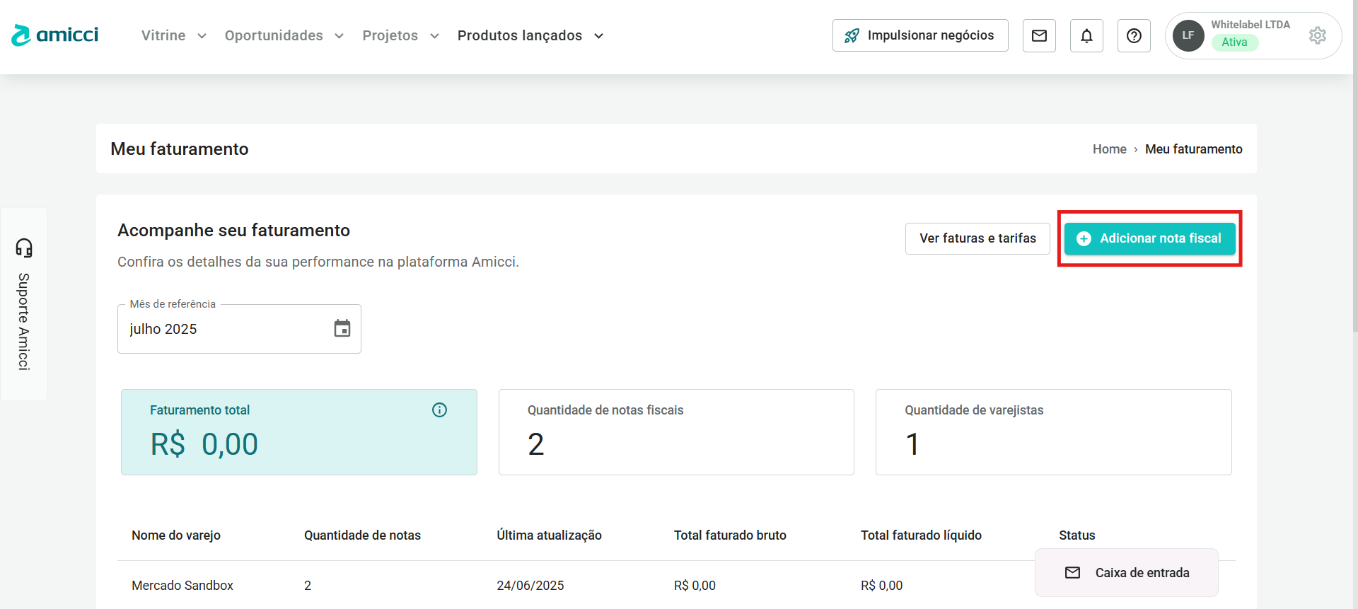 - Na página que irá abrir, clique no botão Adicionar nota fiscal.