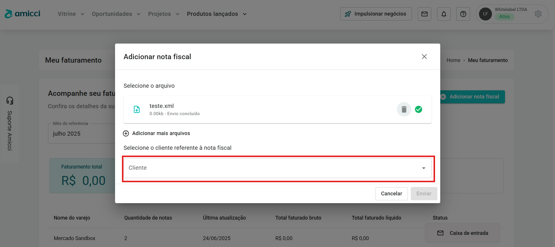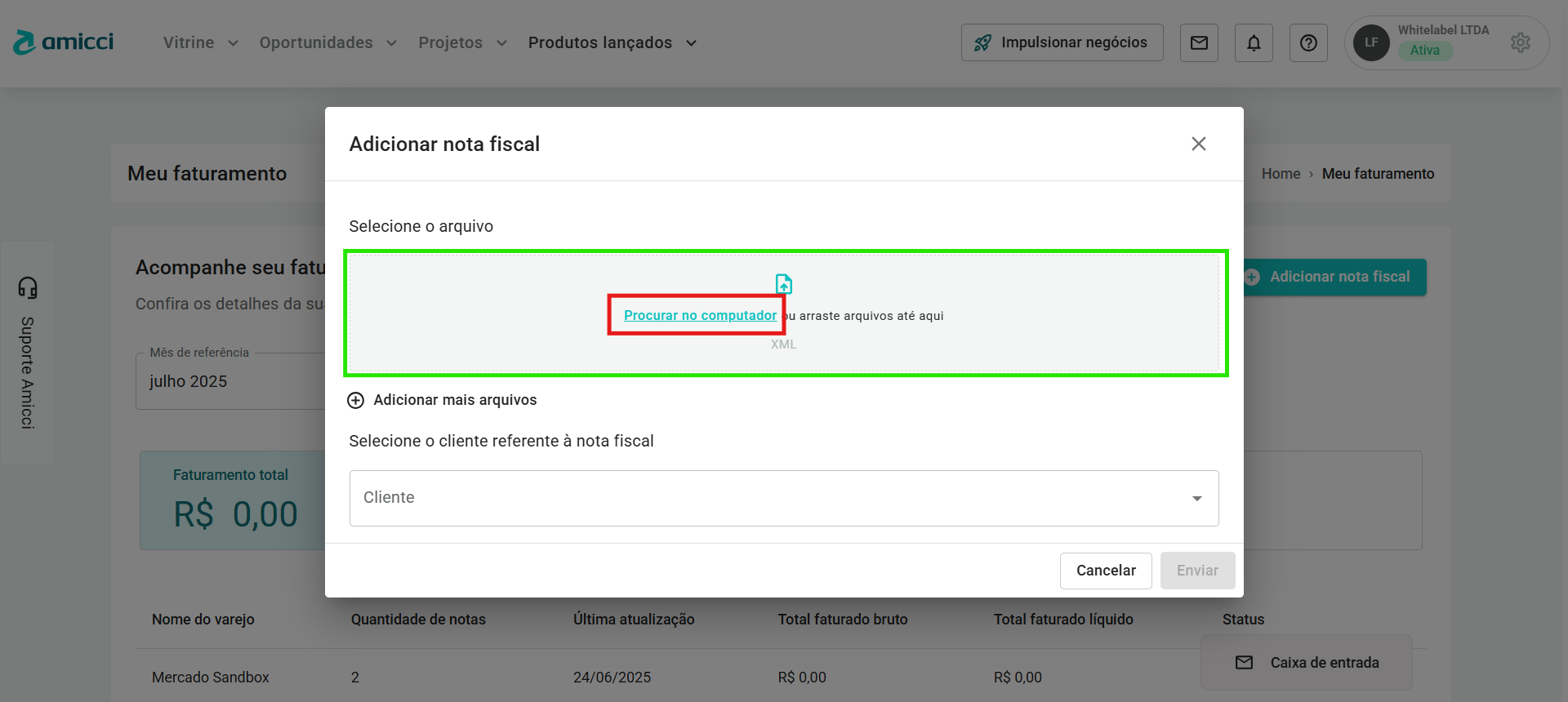 - Isso abrirá uma janela, onde você deve colocar o arquivo de sua nota fiscal e informar o cliente referente a ela. Para fazer isso, você pode:
