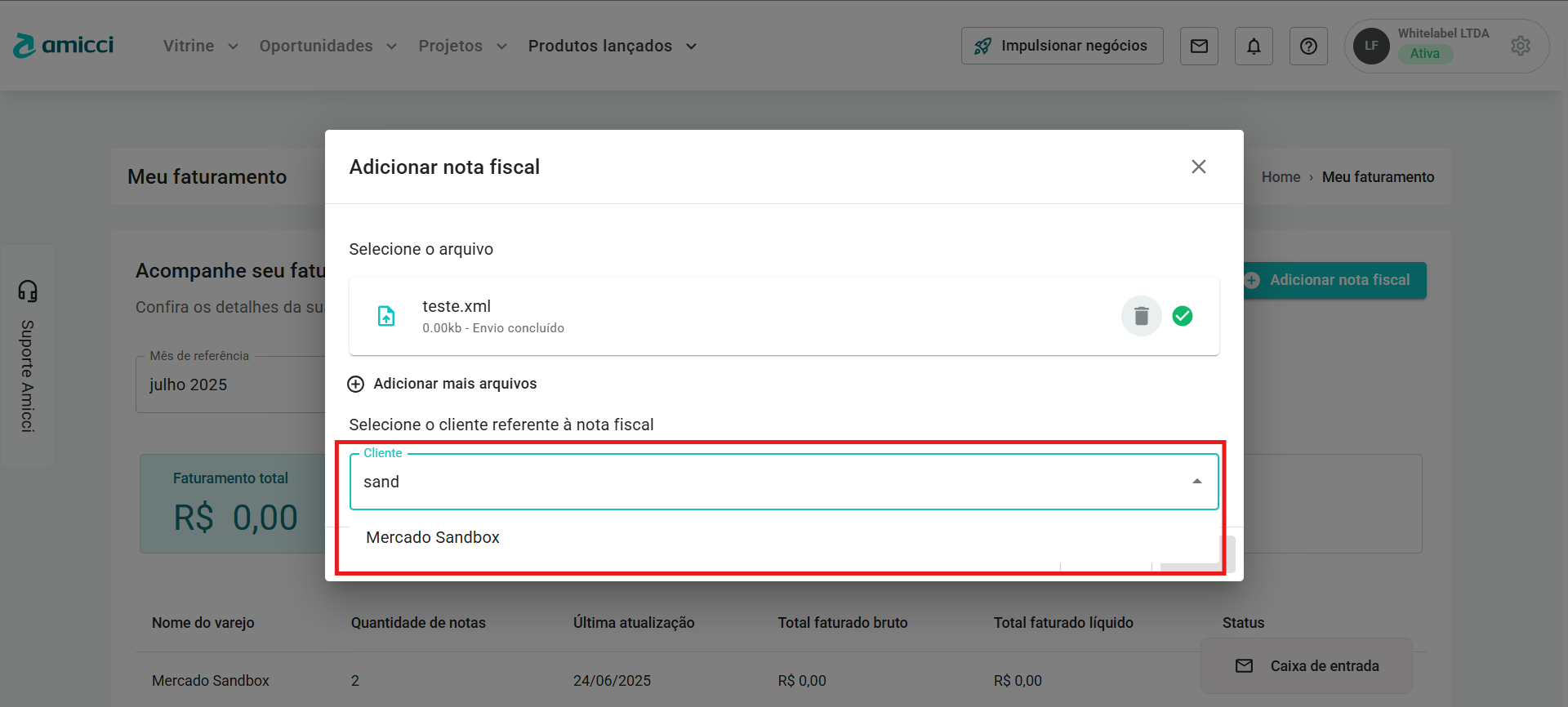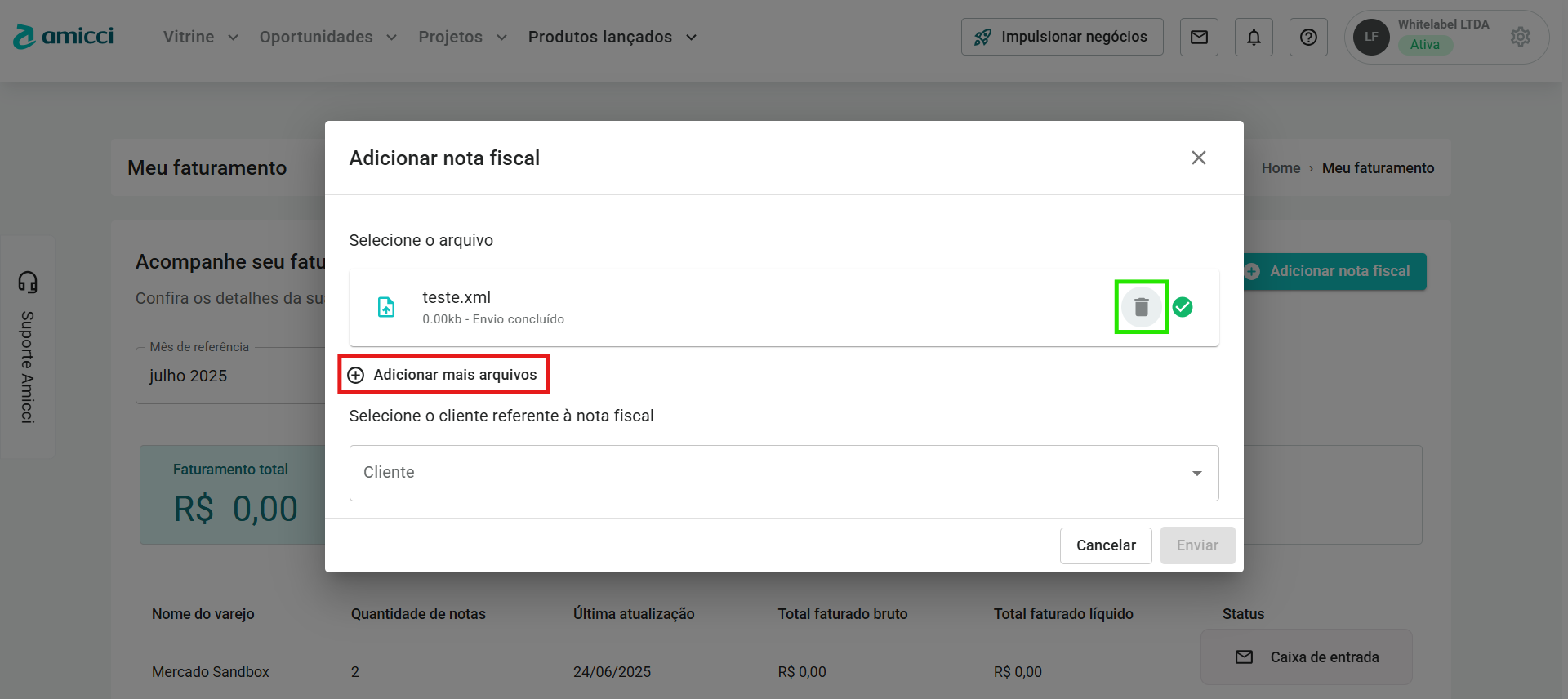 Havendo selecionado os arquivos e os clientes, agora basta clicar no botão Enviar para adicionar as notas fiscais.