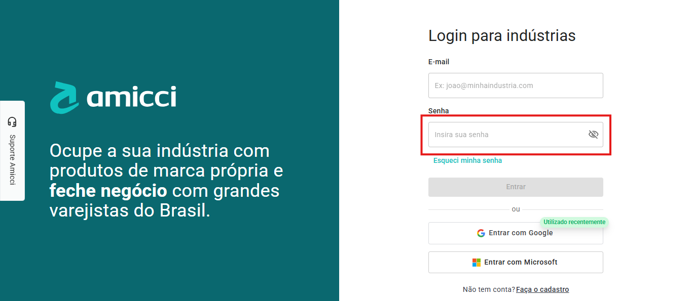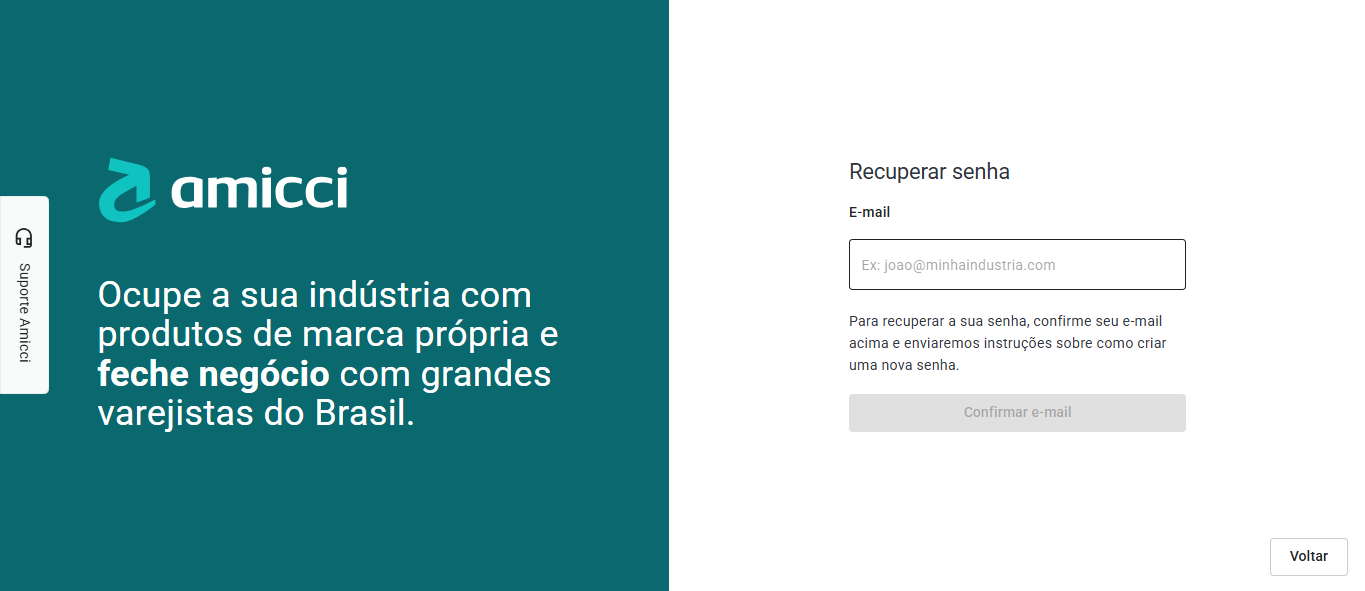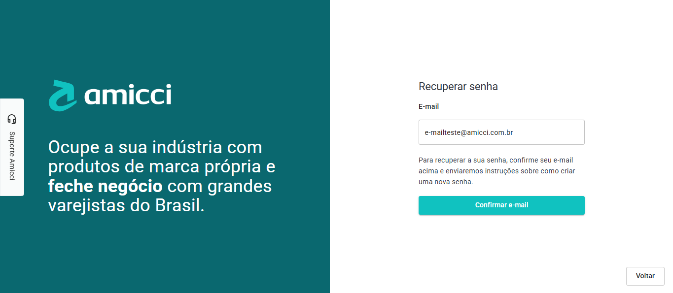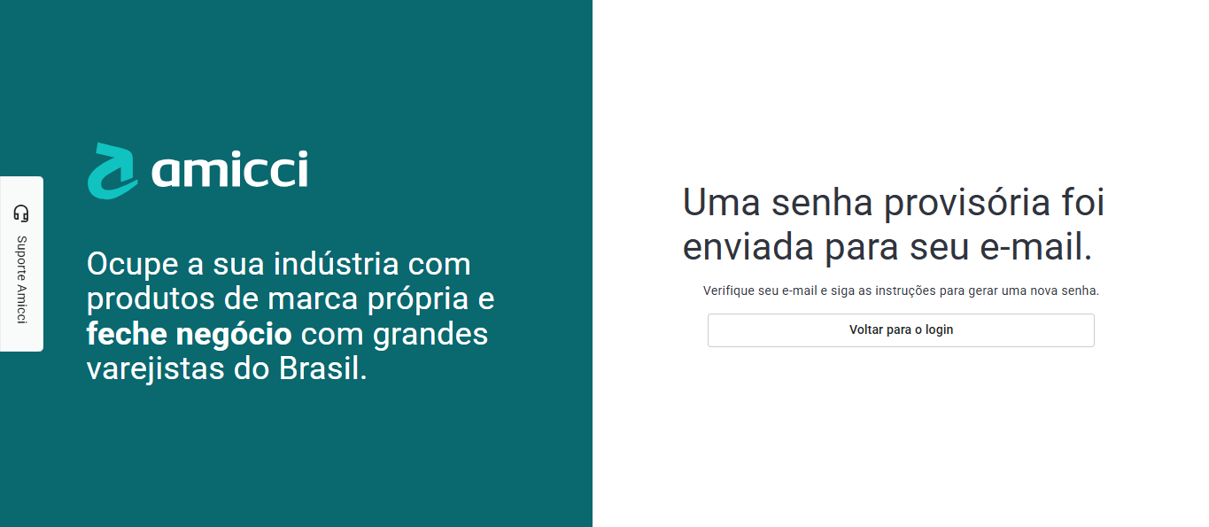 - Clientes: Pelo botão Suporte Amicci presente no canto esquerdo de todas as páginas da plataforma.