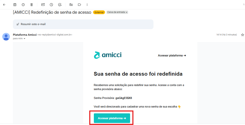 - Após isso, você deve ir até a caixa de entrada do e-mail que você inseriu e, lá, você encontrará um e-mail enviado pela Plataforma Amicci. Dentro desse e-mail, você receberá uma senha provisória. Você deve clicar no botão Acessar plataforma .