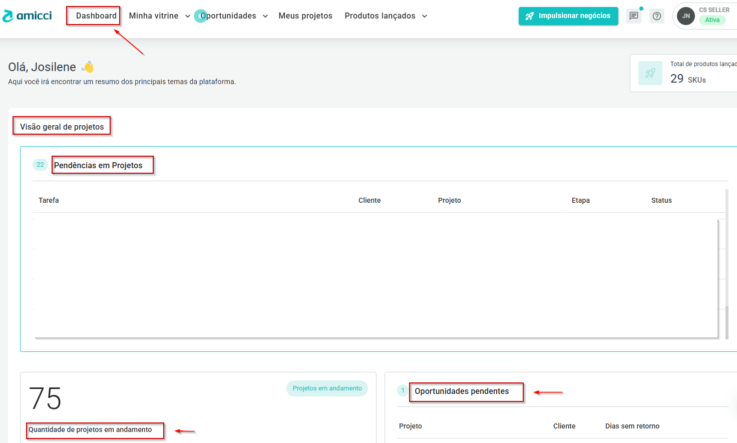 - Pendencias, projetos em andamento, dados da vitrine e seu faturamento.