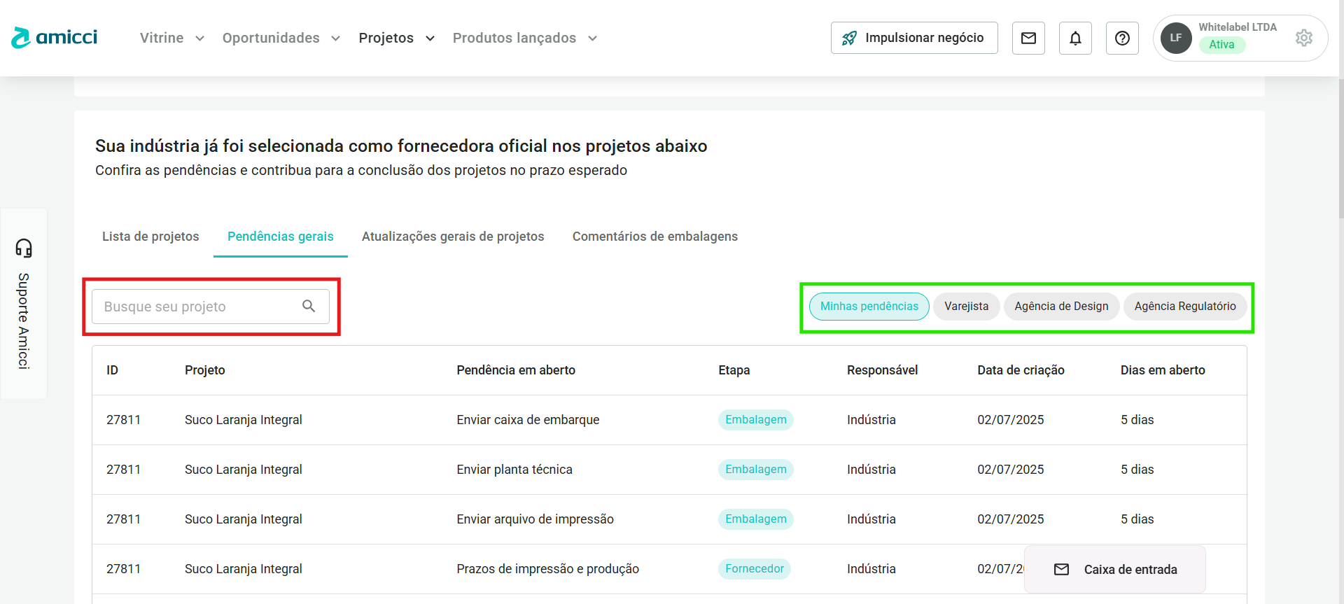 Captura de tela da página Meus Projetos, na aba Pendências gerais