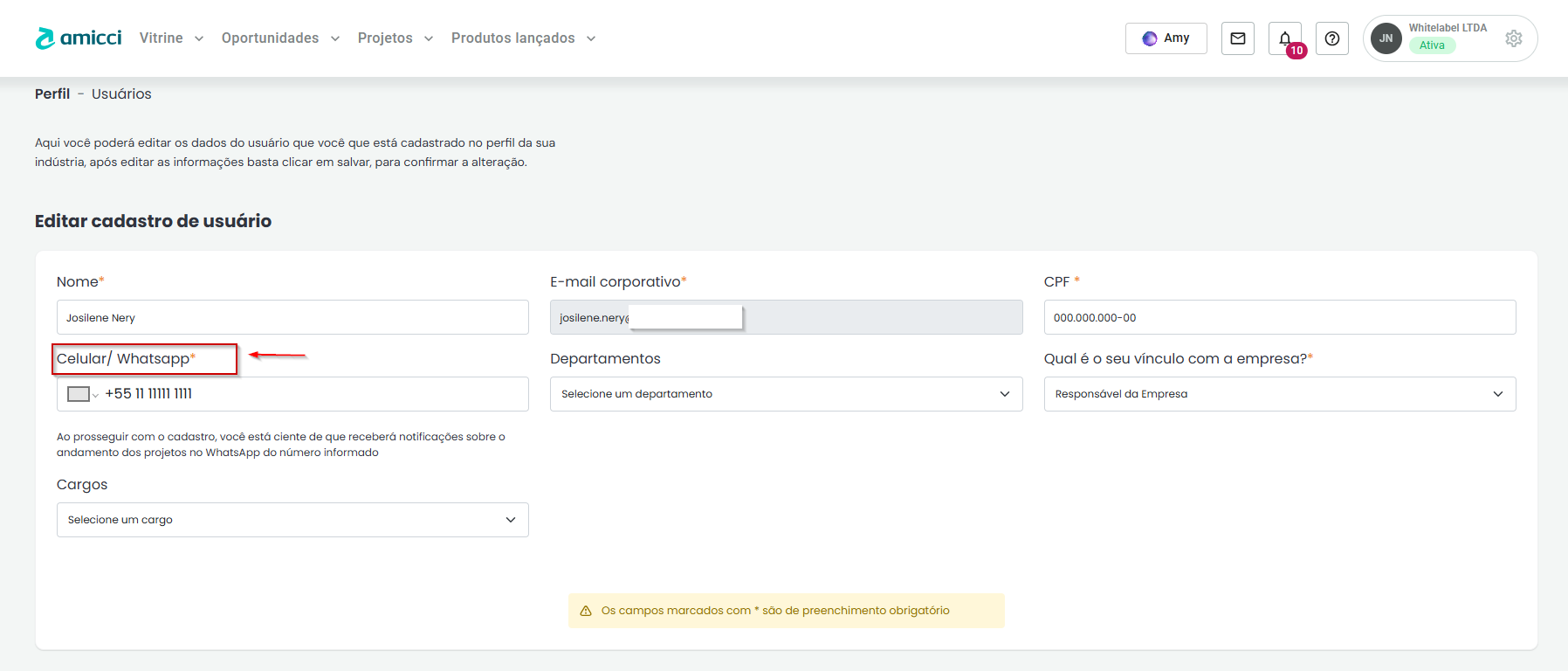 - Informe ou atualize o telefone em "Celular\ Whatsapp"